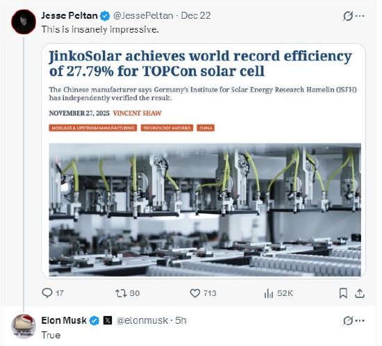 马斯克点赞晶科能源光电转换效率新纪录:“令人印象深刻”